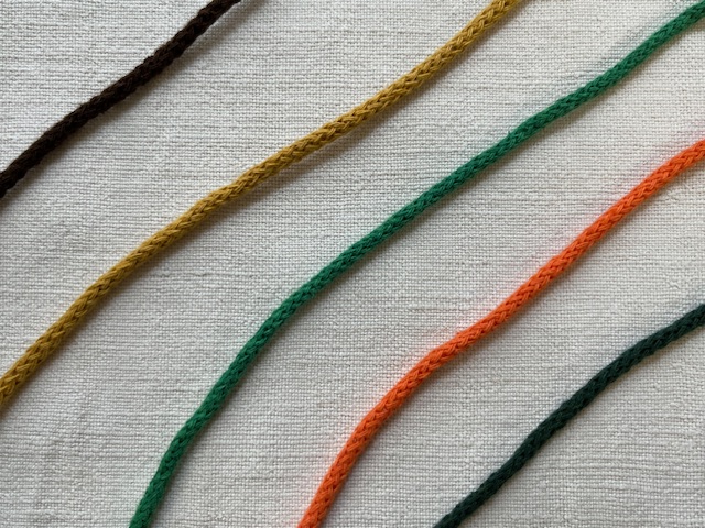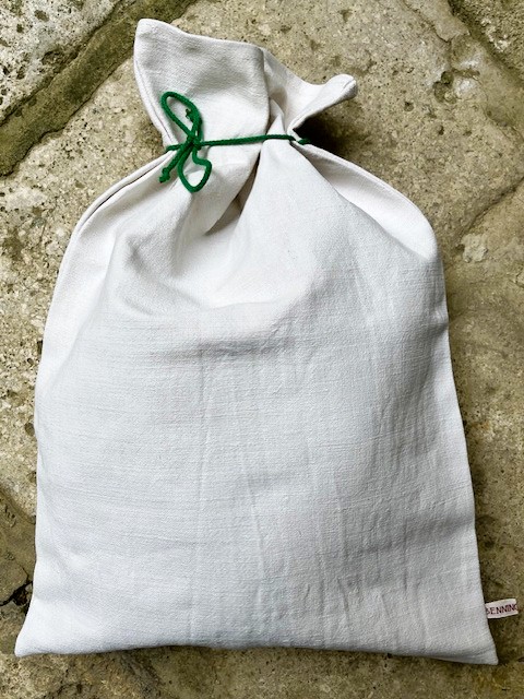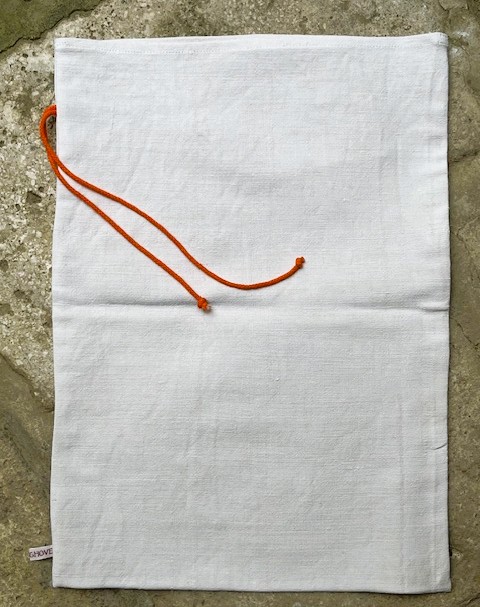 Brotbeutel zur Aufbewahrung oder Transport, aus hellem Leinen mit farbiger Baumwollkordel.