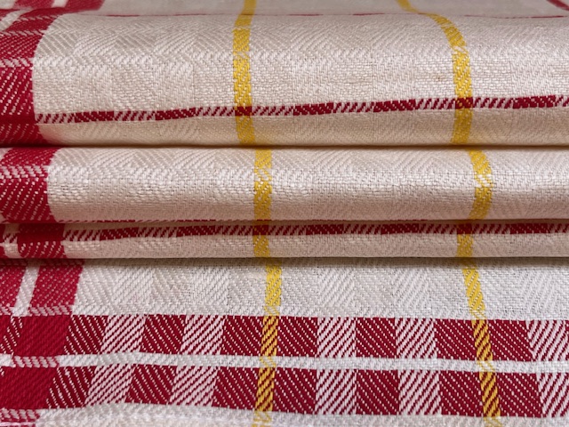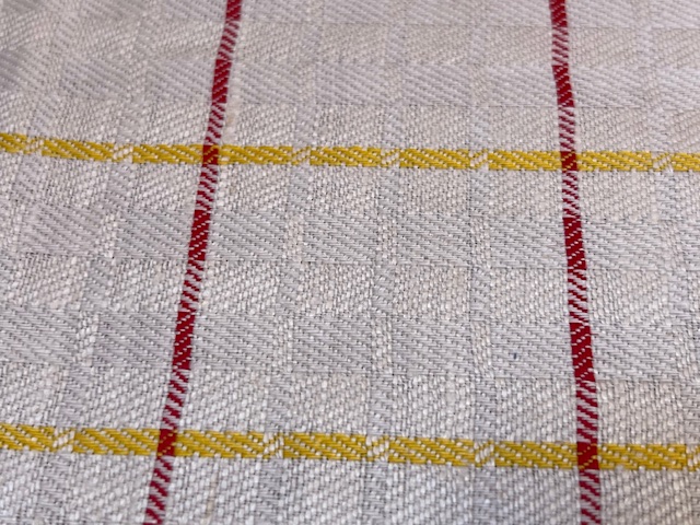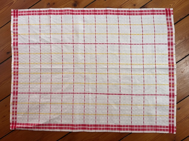 Geschirrtuch, Gläsertuch aus Halbleinen mit Würfelmuster und gelben und roten Streifen.