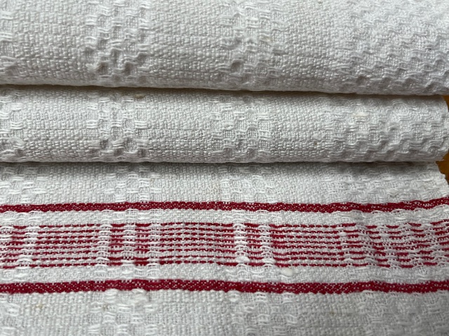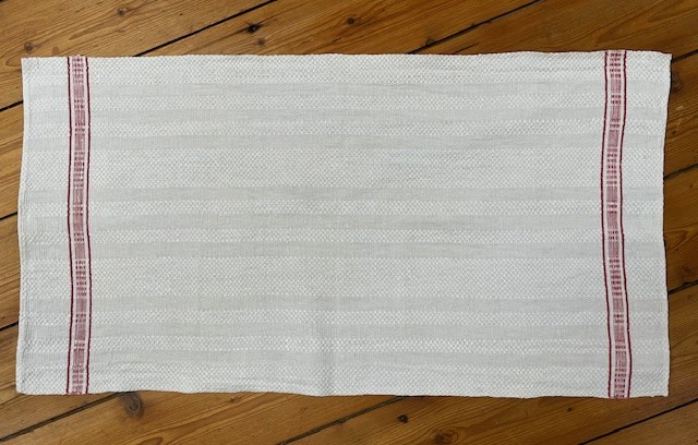 Geschirrtuch, Handtuch aus handgewebtem Leinen mit schönem Webmuster und roter Bordüre.