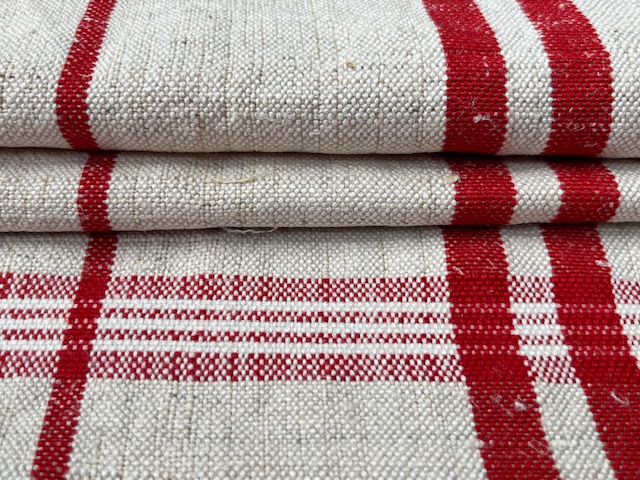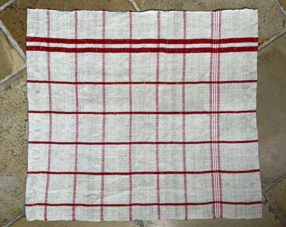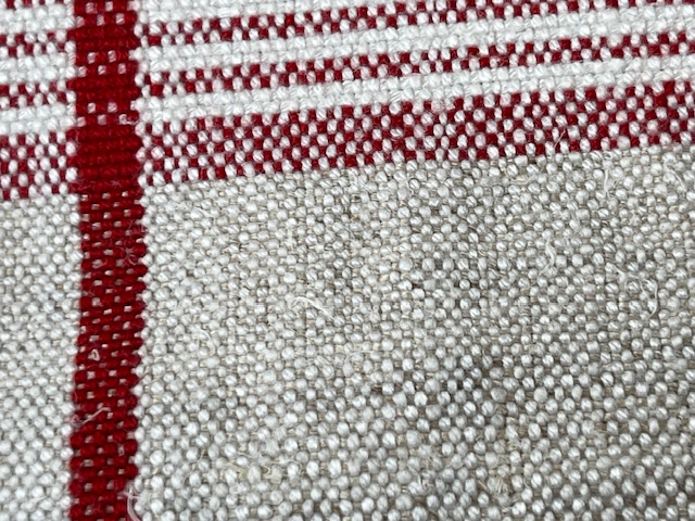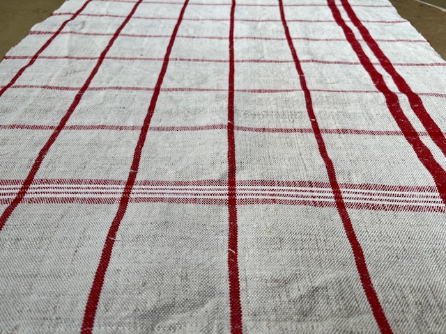 Handtuch aus naturfarbenem Bauernleinen mit rotem Webmuster.