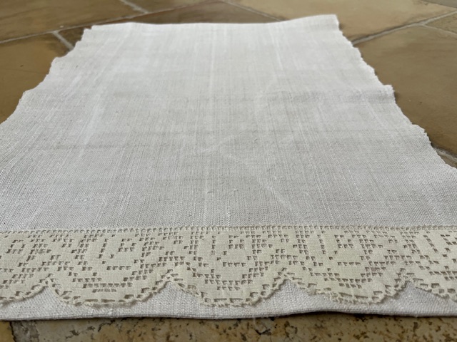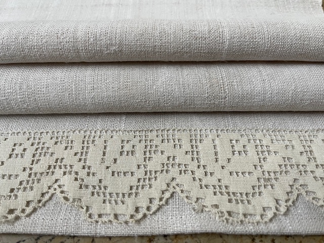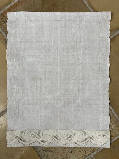 Wunderschönes Handtuch, Gäste-Handtuchtuch aus beige-grauem Leinen mit alter Spitze.