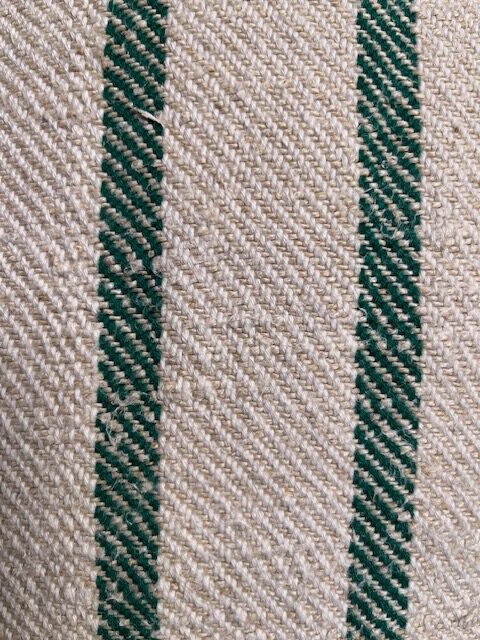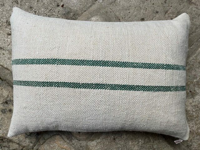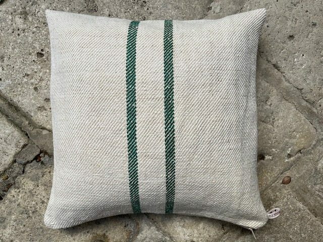 Leinen-Kissen aus Bauernleinen mit grünen Streifen und Reißverschluss.