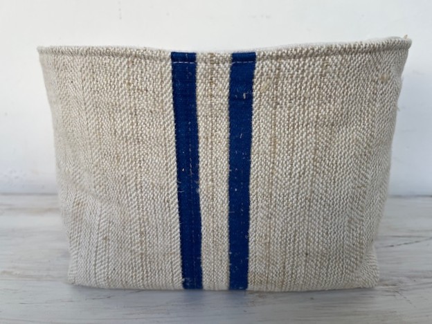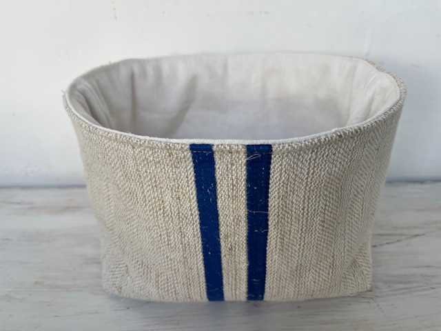 Eine Seite grobes Leinen mit blauen Streifen, eine Seite glattes helles Leinen. Durch Wenden ist das Körbchen beidseitig verwendbar.