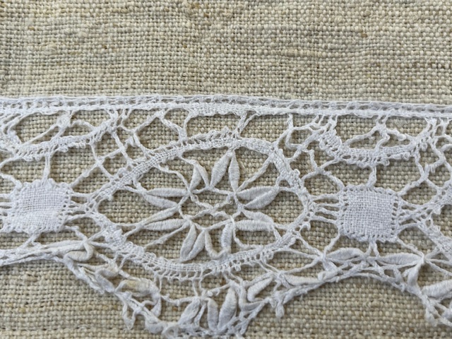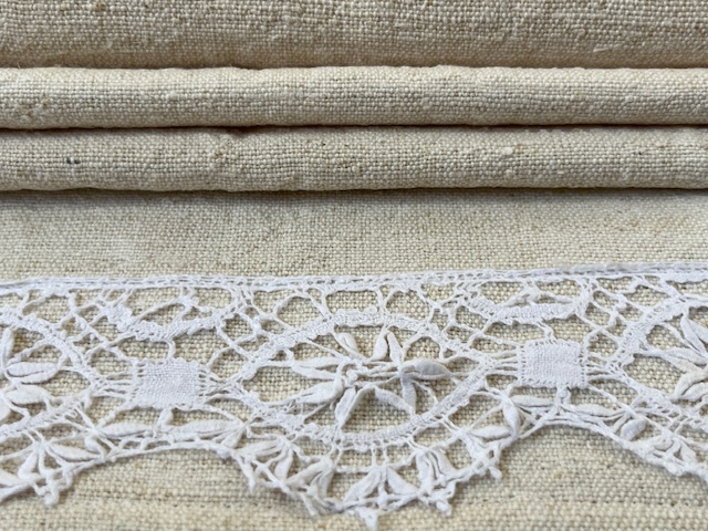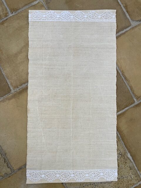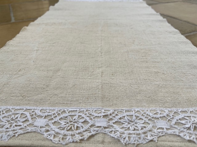 Leinen-Tischläufer aus handgewebtem Leinen und alter handgefertigter Klöppelspitze.