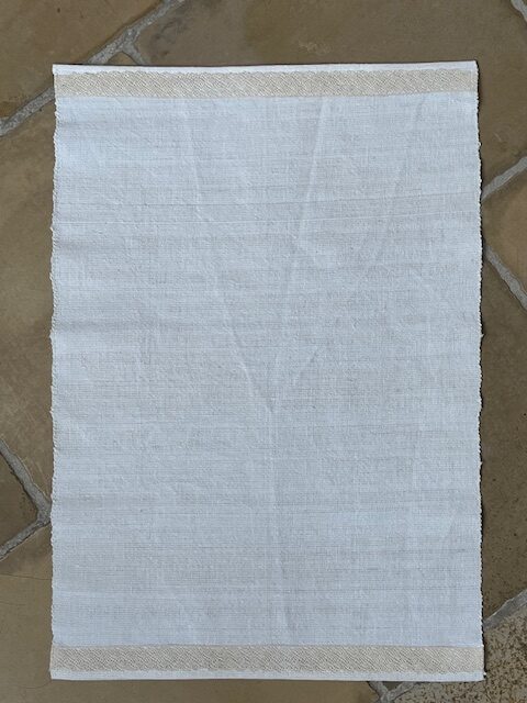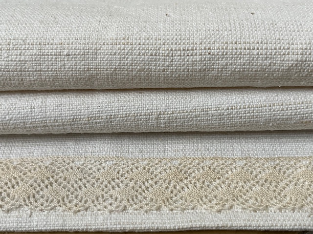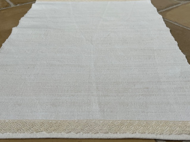 Kleiner Leinen-Tischläufer aus hellem handgewebtem Leinen und antiker Spitze.